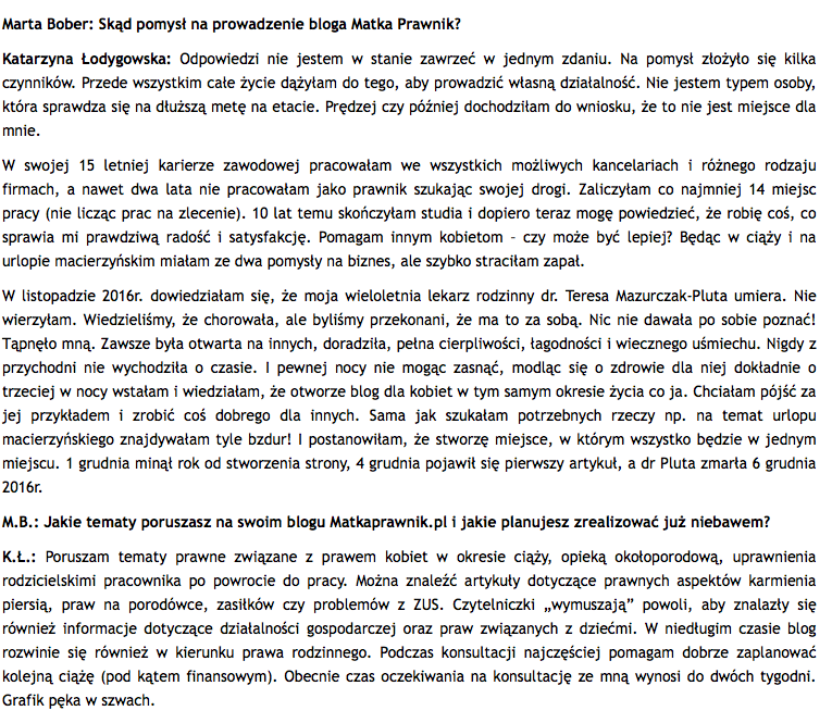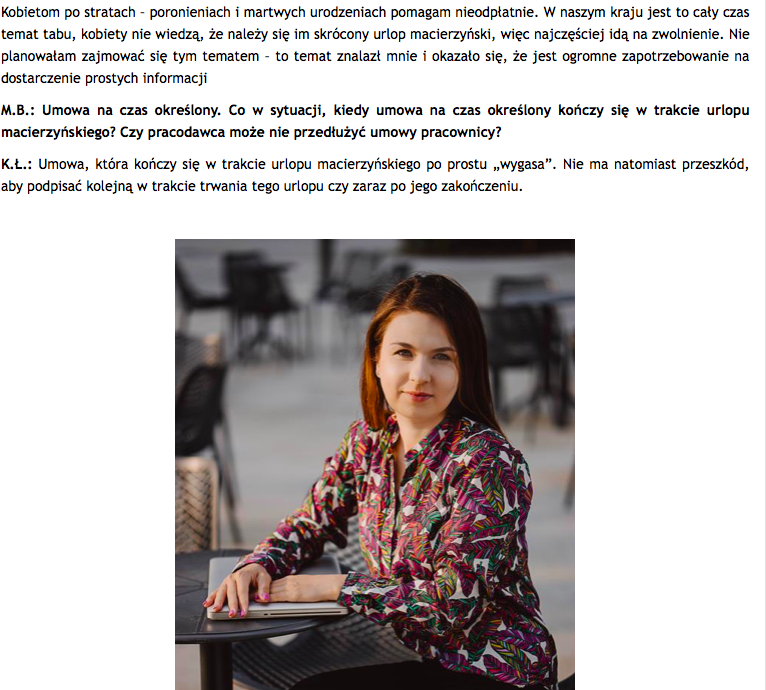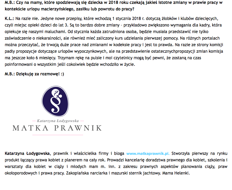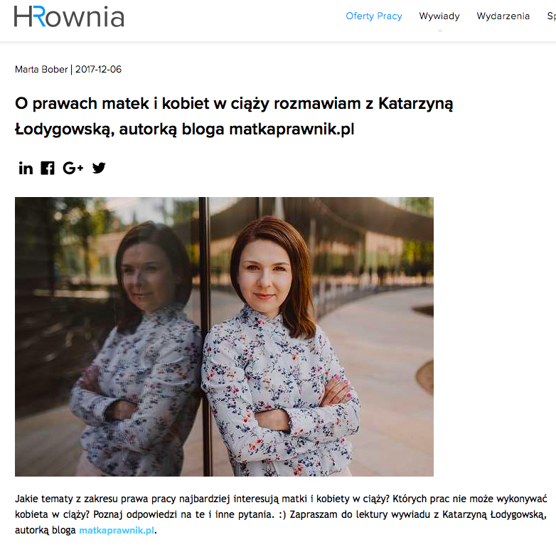 Udzieliłam wywiadu portalowi www.hrownia.pl. O tym jak powstał blog i firma www.matkaprawnik.pl oraz o prawach matek i kobiet w ciąży, rozmawiam z redaktor naczelną Martą Bober. Tekst dostępny TUTAJlub poniżej. Serdecznie zapraszam!